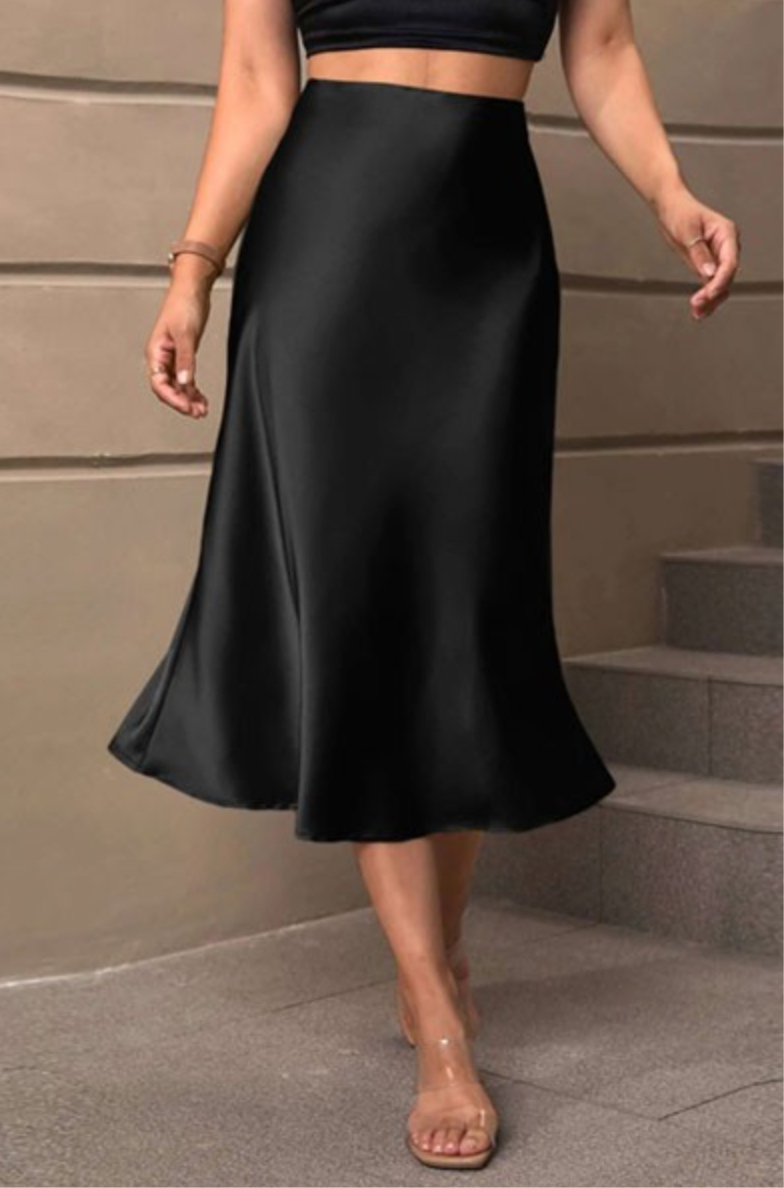 HIGH-QUALITY AND SOFT SATIN FABRIC, HIGH WAIST ELEGANT FLARED MIDI RUFFLE SKIRT WITH SIDE INVISIBLE ZIPPER UP. A LINE AND FLARED SHAPED, ZIPPER CLOSURE, UNDER KNEE LENGTH MIDI SKIRT.