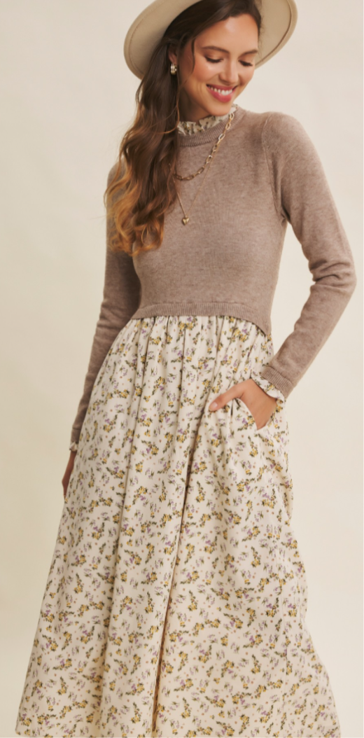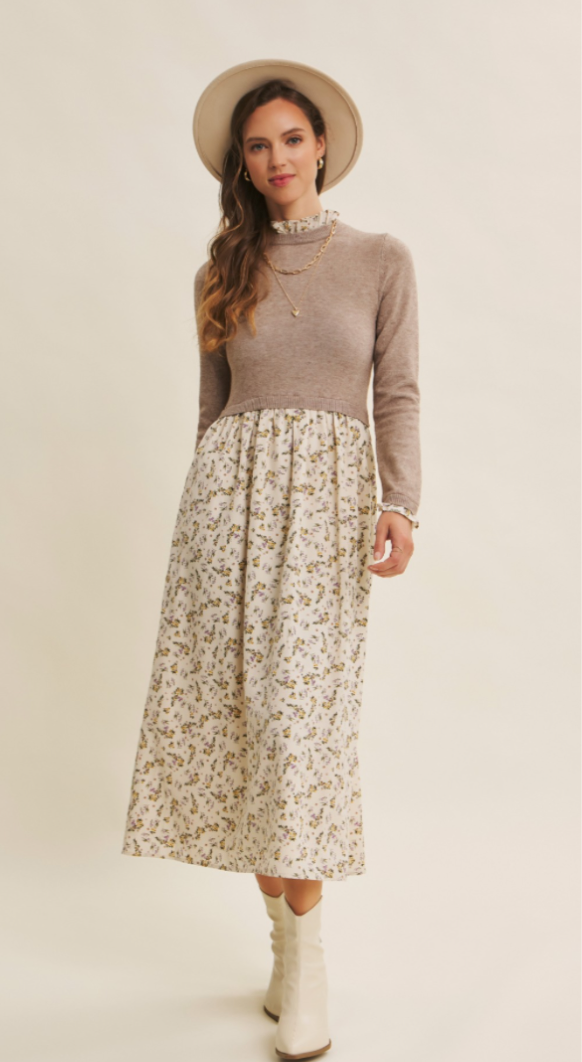 MIDI TOFER DRESS WITH SOFT SWEATER KNIT TOP AND FLORAL WOVEN SKIRT.